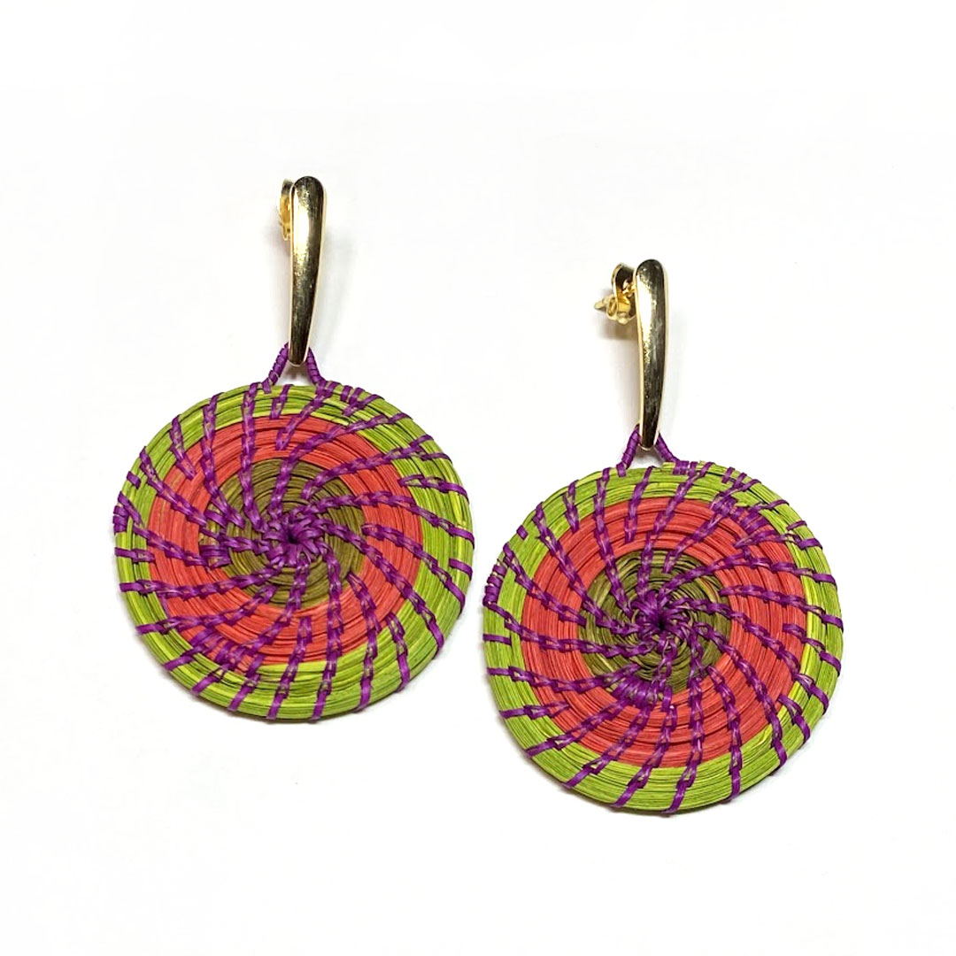 Inspired by Bolivia’s vibrant roots, these Carnaval Vibrante (Vibrant Carnival) earrings are handwoven from palm leaves collected in the forest and delicately hand-painted in vivid hues. Each spiral design honors the connection between earth and sun, nature and tradition — a true piece of wearable art crafted by indigenous artisans.