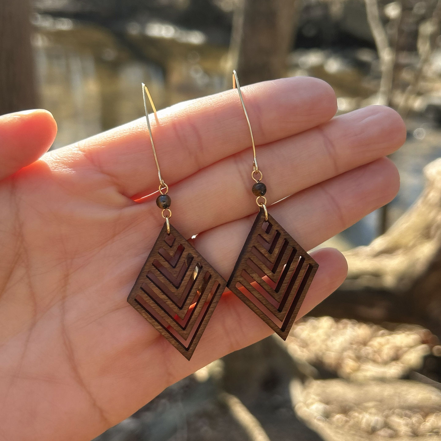 Each earring showcases a laser-cut chevron pattern in a rhombus shape, crafted from high-quality wood and hand-painted with a rich, earthy hue. The intricate design is enhanced by the natural grain of the wood, adding depth and texture to these lightweight statement pieces.