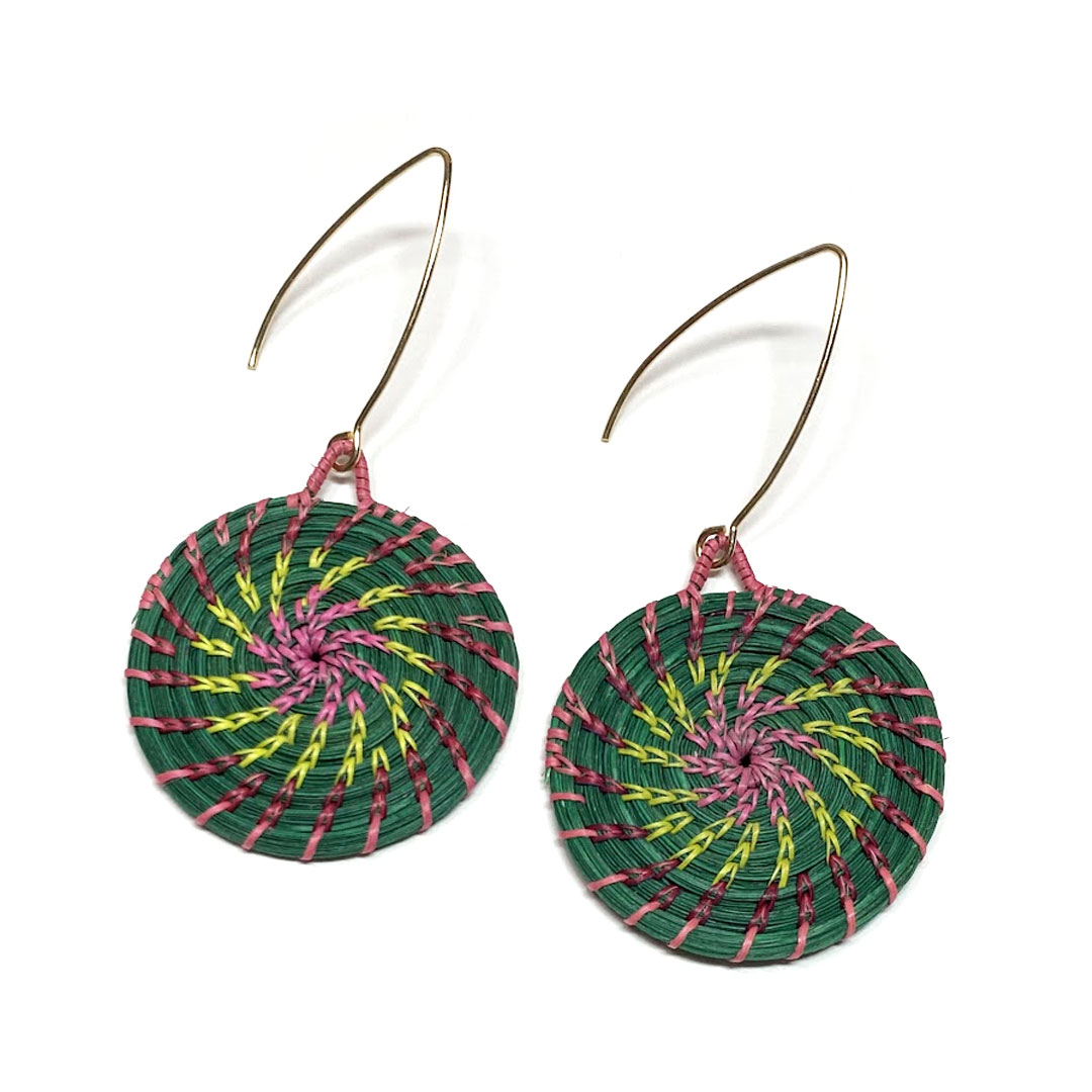 Inspired by Bolivia’s vibrant roots, these Emerald Spiral earrings are handwoven from palm leaves collected in the forest and delicately hand-painted in vivid hues. Each spiral design honors the connection between earth and sun, nature and tradition — a true piece of wearable art crafted by indigenous artisans.