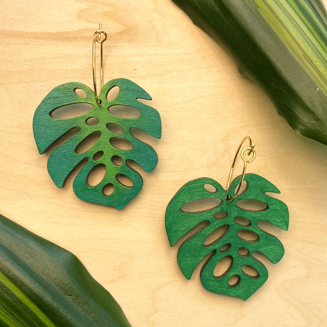Each earring features a detailed Monstera leaf design, laser-cut from high-quality wood and hand-painted with vibrant green acrylics. The leaf’s delicate contours are accentuated by the natural grain of the wood, creating an organic, yet polished look.