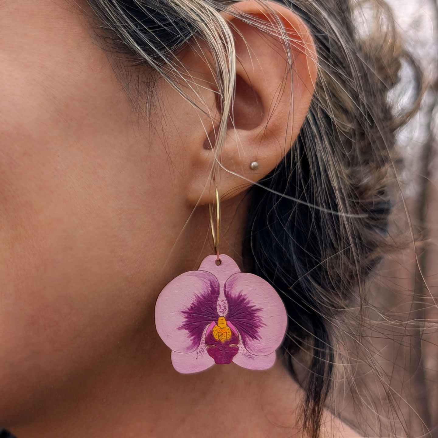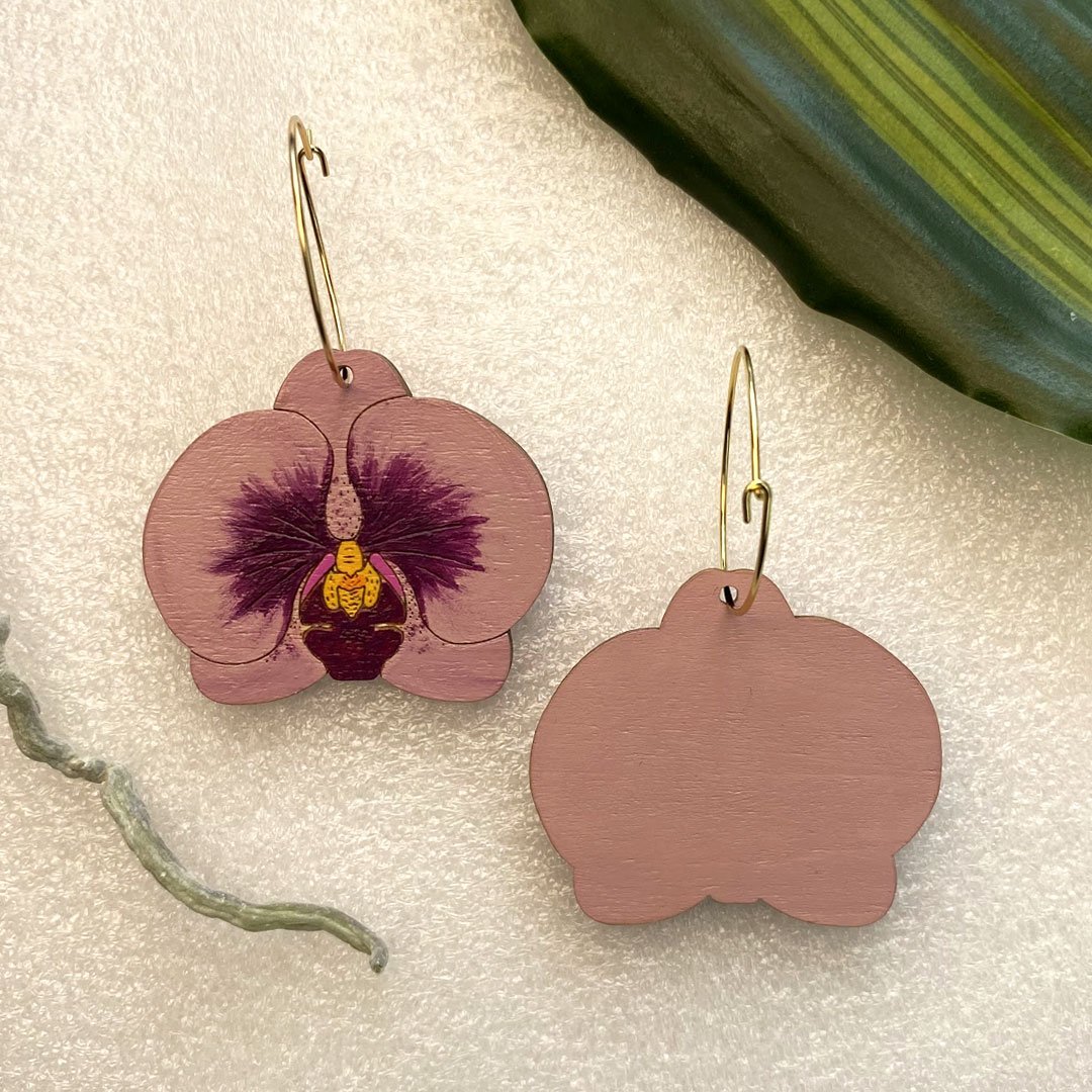 Each earring showcases a meticulously laser-cut wooden orchid, hand-painted to perfection with soft pink petals and a vibrant purple center. The intricate detailing brings these miniature flowers to life, from the delicate veining to the golden yellow accents at the heart of each blossom.